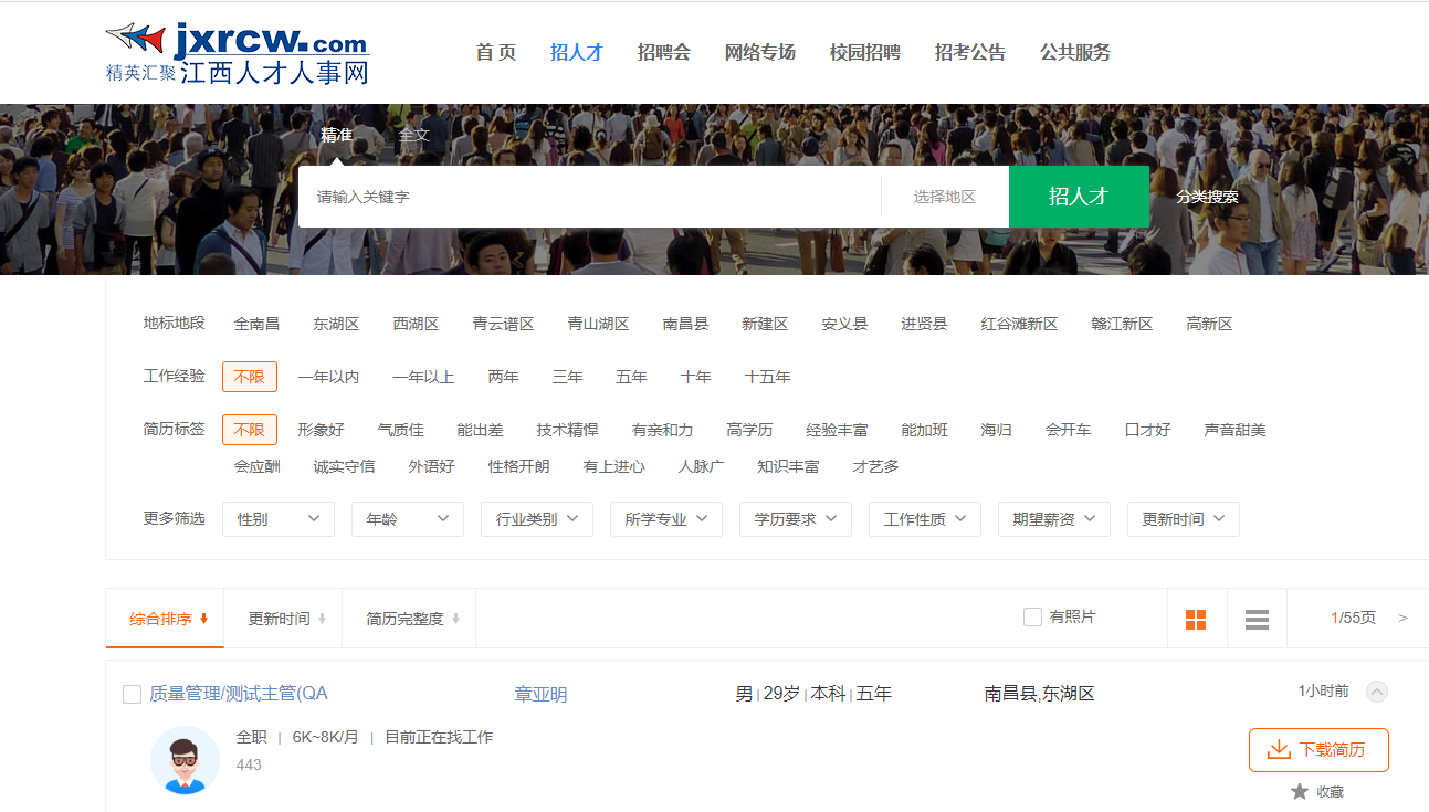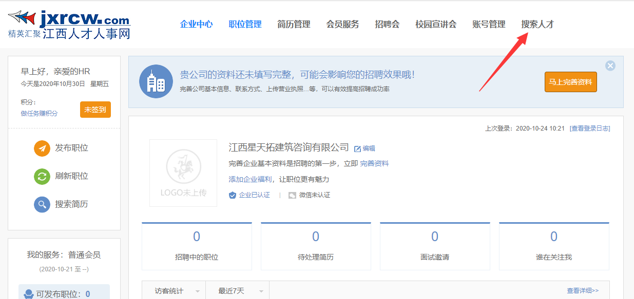 1.進(jìn)入江西人才人事網(wǎng)企業(yè)會(huì)員中心,通過上面頂部的導(dǎo)航列表,進(jìn)入“搜索人才”頁(yè)面: