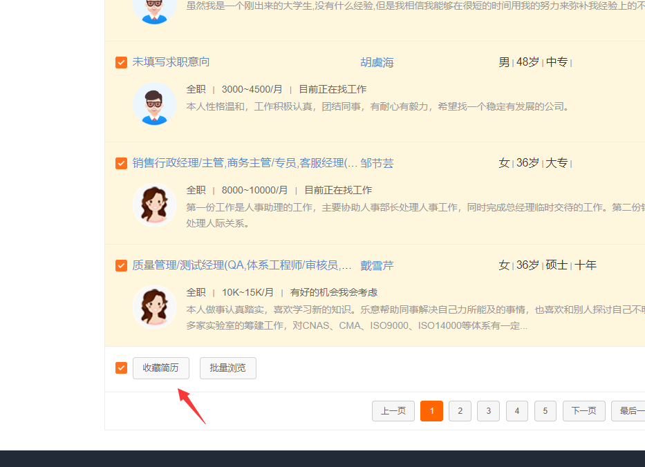 3、勾選合適的簡(jiǎn)歷,點(diǎn)擊列表下面的【收藏簡(jiǎn)歷】按鈕,或者直接在合適的簡(jiǎn)歷下方點(diǎn)擊【加入人才庫(kù)】按鈕: