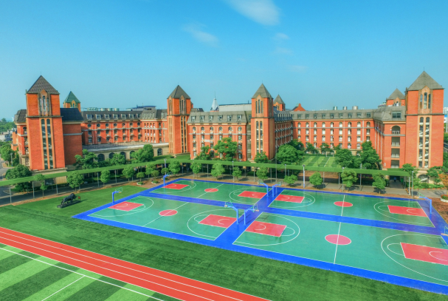 學(xué)??偼顿Y2億8千余萬(wàn)元,校園占地面積182畝,建筑面積98000平方米,有室內(nèi)恒溫游泳館、2200平方米室內(nèi)體育館、600座音樂(lè)廳、600平方米樂(lè)器教室、120平方米咖啡廳、還有高爾夫球訓(xùn)練場(chǎng)、足球場(chǎng)、網(wǎng)球場(chǎng)、籃球場(chǎng)、1200米自行車道等。校園集園林綠地的觀賞性和體育運(yùn)動(dòng)的使用性于一身,綠地環(huán)抱,環(huán)境優(yōu)美,充滿活力,讓學(xué)生時(shí)時(shí)刻刻感知健康、文化與原生態(tài),提升幸福感。