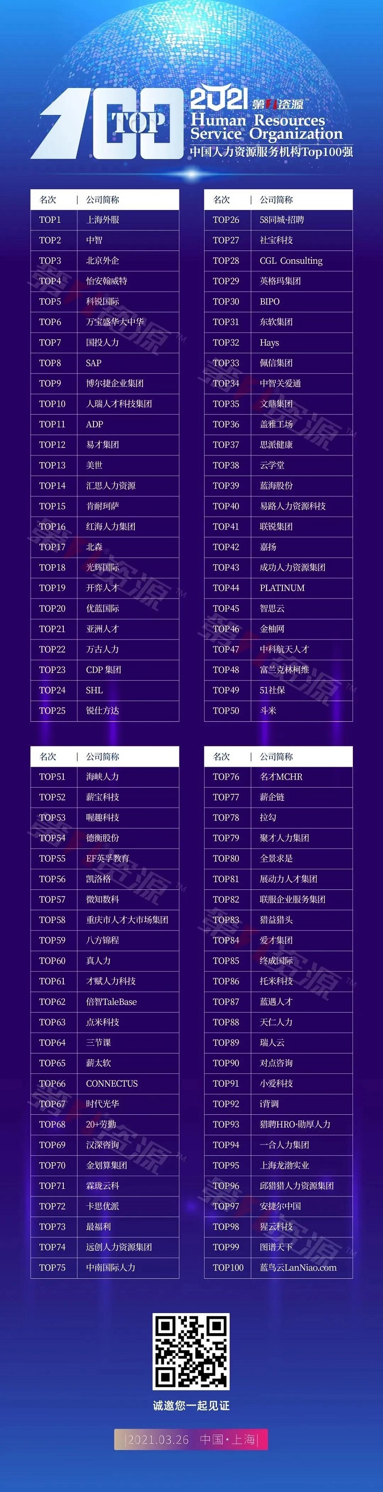 “中國人力資源服務(wù)機構(gòu)TOP100強”榜單由深耕行業(yè)多年的人力資源第三方媒體與產(chǎn)業(yè)服務(wù)平臺第一資源發(fā)起,是人力資源服務(wù)行業(yè)具有影響力的全國性評選活動,綜合考量各服務(wù)機構(gòu)品牌影響力、營收能力、服務(wù)品質(zhì)、發(fā)展?jié)摿Φ榷鄠€維度,聯(lián)動業(yè)界專家、學(xué)院教授、國家級人力資源服務(wù)產(chǎn)業(yè)園,經(jīng)過報名申請、網(wǎng)絡(luò)投票和專家評審環(huán)節(jié),最終評選發(fā)布。榜單旨在展現(xiàn)中國人力資源服務(wù)機構(gòu)的風(fēng)采,促進業(yè)內(nèi)交流,碰撞行業(yè)新知,激發(fā)產(chǎn)業(yè)活力,引領(lǐng)行業(yè)發(fā)展。