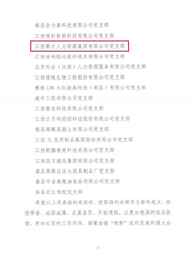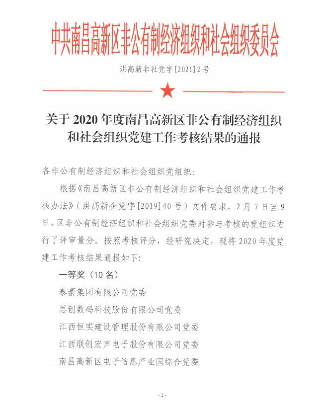 日前,南昌市高新區(qū)非公有制經(jīng)濟組織和社會組織委員會黨委對區(qū)內有關黨組織黨建工作進行了考核評審,聚才人力集團黨支部榮獲2020年度南昌市高新區(qū)非公社黨建工作三等獎。
