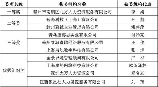 優(yōu)秀組織獎(jiǎng)4名:全景閃查背調(diào)平臺(tái)、抖招、勞動(dòng)關(guān)系事務(wù)性托管服務(wù)、贛州人才鏈。