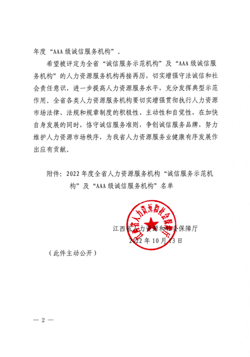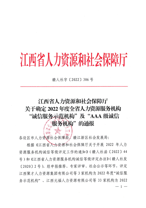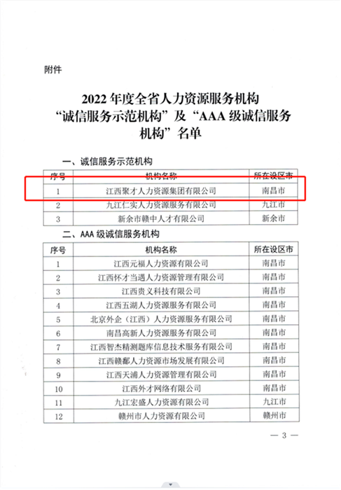 根據(jù)《江西省人力資源和社會保障廳關(guān)于開展2022年人力資源服務(wù)機構(gòu)誠信等級評定工作的通知》(贛人社函〔2022〕44號)和《江西省人力資源服務(wù)機構(gòu)誠信等級評定辦法》(贛人社發(fā)〔2020〕2號),經(jīng)申報推薦、專家評審、社會公示等環(huán)節(jié),江西聚才人力資源集團有限公司(以下簡稱“聚才人力集團”)獲評2022年度“誠信服務(wù)示范機構(gòu)”。
